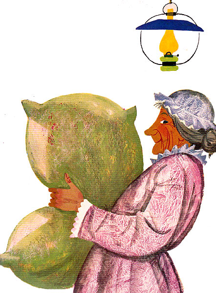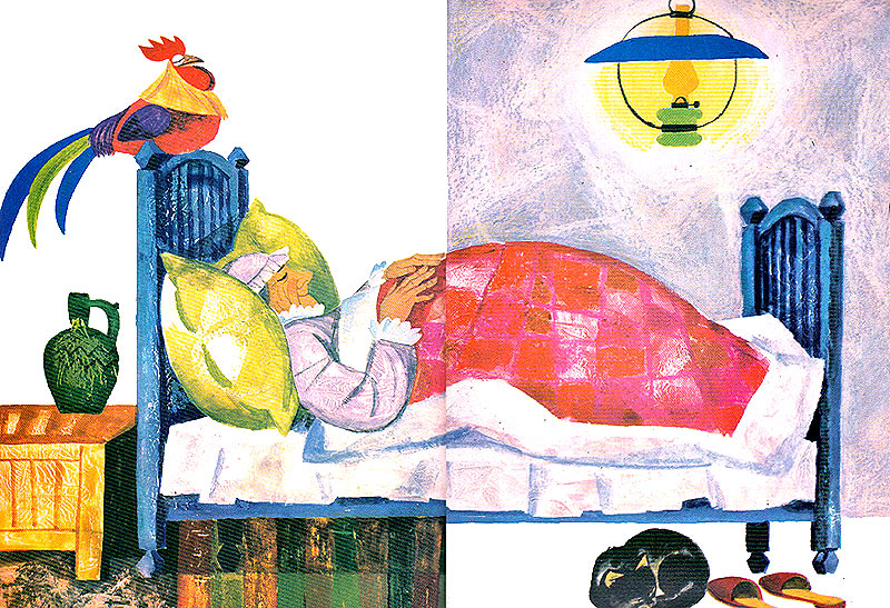 The old woman hurried back home. Early in the evening, she locked her goat in its pen, and took the cat and cock with her in the hut.