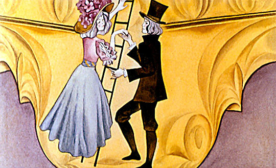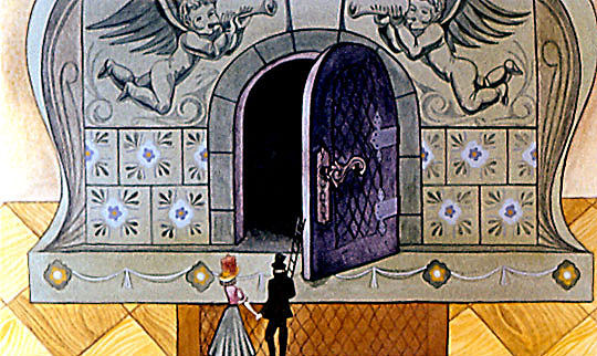 Then he comforted her, and showed her how to place her little foot on the carved edge and gilt-leaf ornaments of the table. He brought his little ladder to help her, and so they contrived to reach the floor.